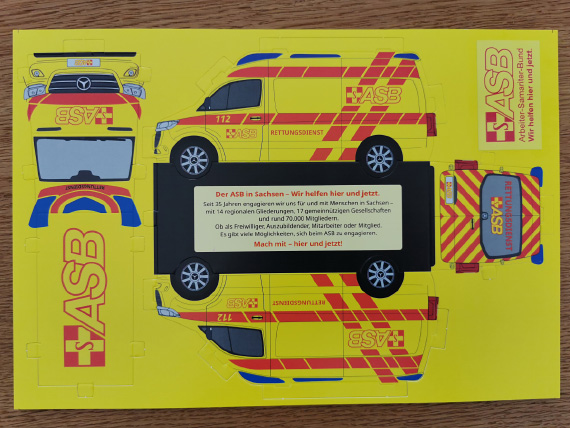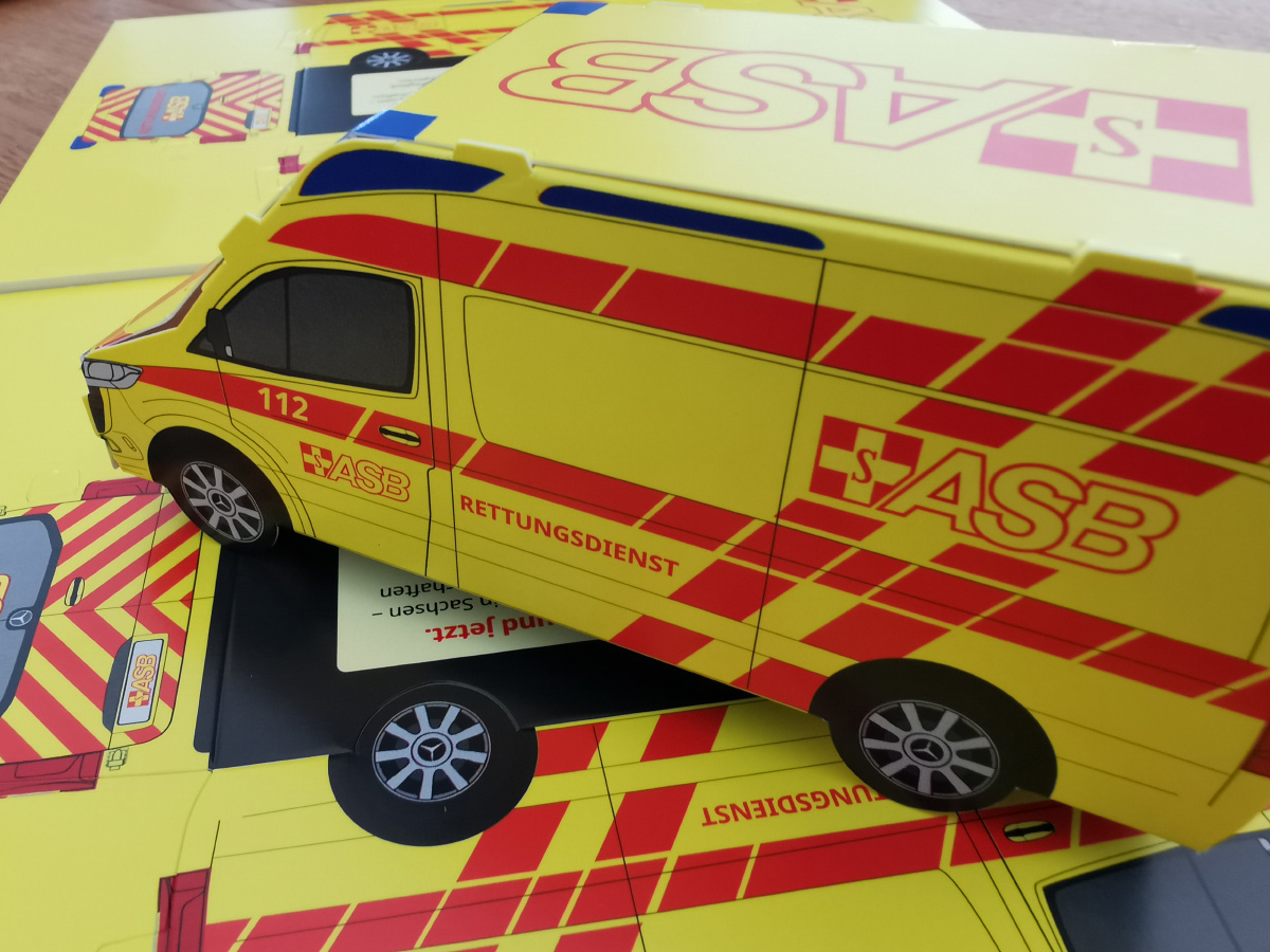 Für den ASB Landesverband Sachsen haben wir ein besonderes Highlight umgesetzt: einen Bastel-RTW (Rettungswagen) im Original-Layout des ASB. Der Rettungswagen wird auf praktischen A4-Bögen geliefert, ist gestanzt und gerillt und lässt sich somit einfach und ohne Kleben oder Schneiden zusammensetzen.